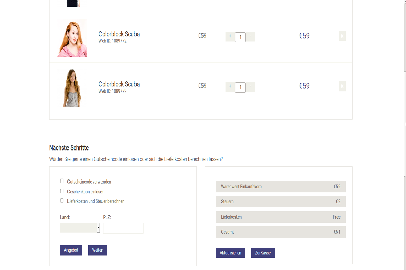 Inhaltsübersicht, Gutscheincodes, Lieferkosten und Steuerrechner, CheckOut