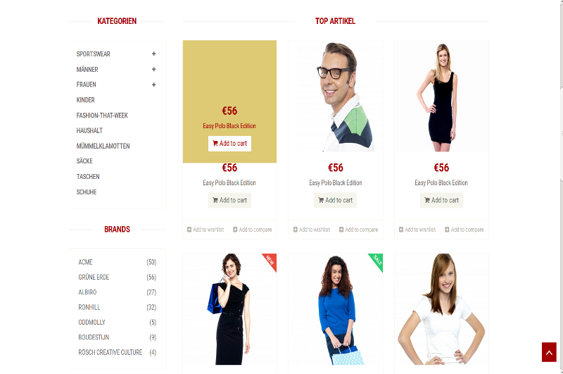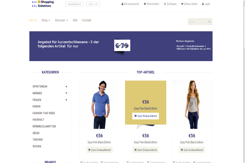 Slider, Wahl-Sprache&Währung, Benutzerkonten, Wunschlisten, Einkaufskorb, CheckOut Bereich